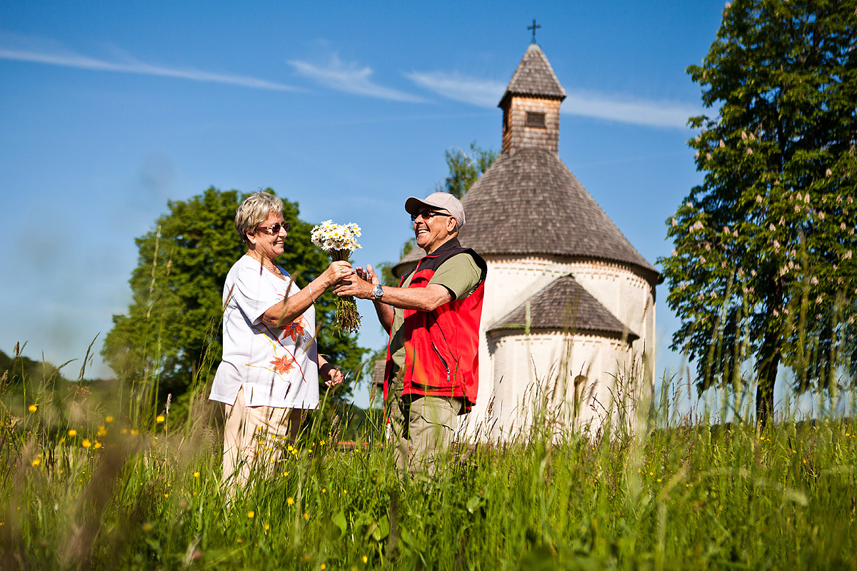 Viste le caratteristiche della costruzione, si presume che questo santuario rotondo sia ciò che resta di un edificio medioevale di maggiori dimensioni. Delle prime pitture si è conservata la composizione raffigurante la marcia e l’inchino dei tre re; si presume che risalga al primo terzo del XIV secolo. Il carattere artistico viene espresso anche nella raffigurazione della Passione di Cristo realizzata come affresco intorno al 1400. L’ingresso nella Rotonda rappresenta simbolicamente l’arrivo di Cristo a Gerusalemme: il perché lo scoprirete quando verrete a visitarla.